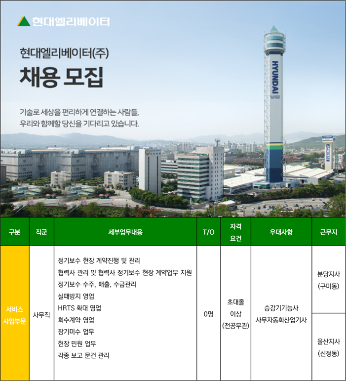[현대엘리베이터] 승강기 서비스 영업사원 채용 모집