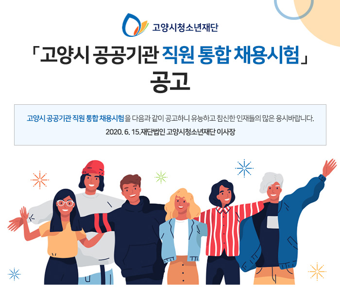 고양시 공공기관 직원 통합 채용시험을 다음과 같이 공고하니 유능하고 참신한 인재들의 많은 응시바랍니다. 2020. 6. 15.재단법인 고양시청소년재단 이사장