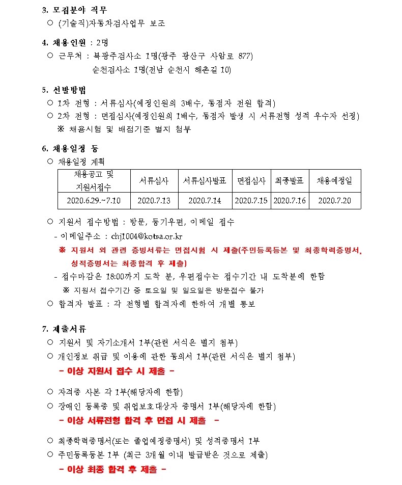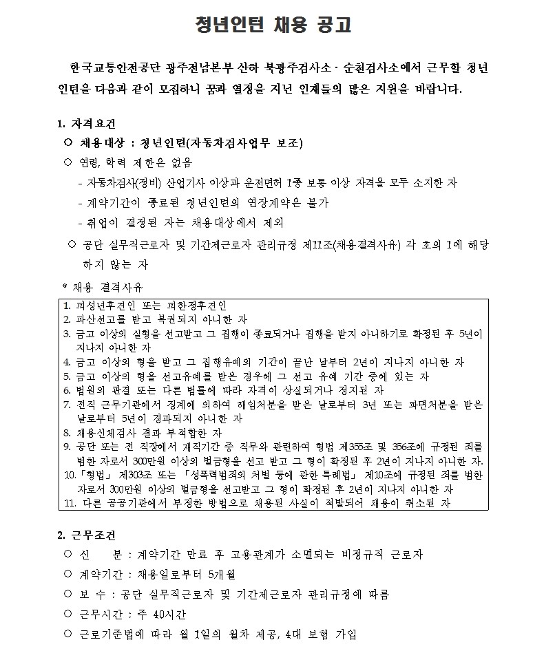 [한국교통안전공단 광주전남본부] 관내 자동차검사소 청년인턴(자동차검사 보조) 채용 공고