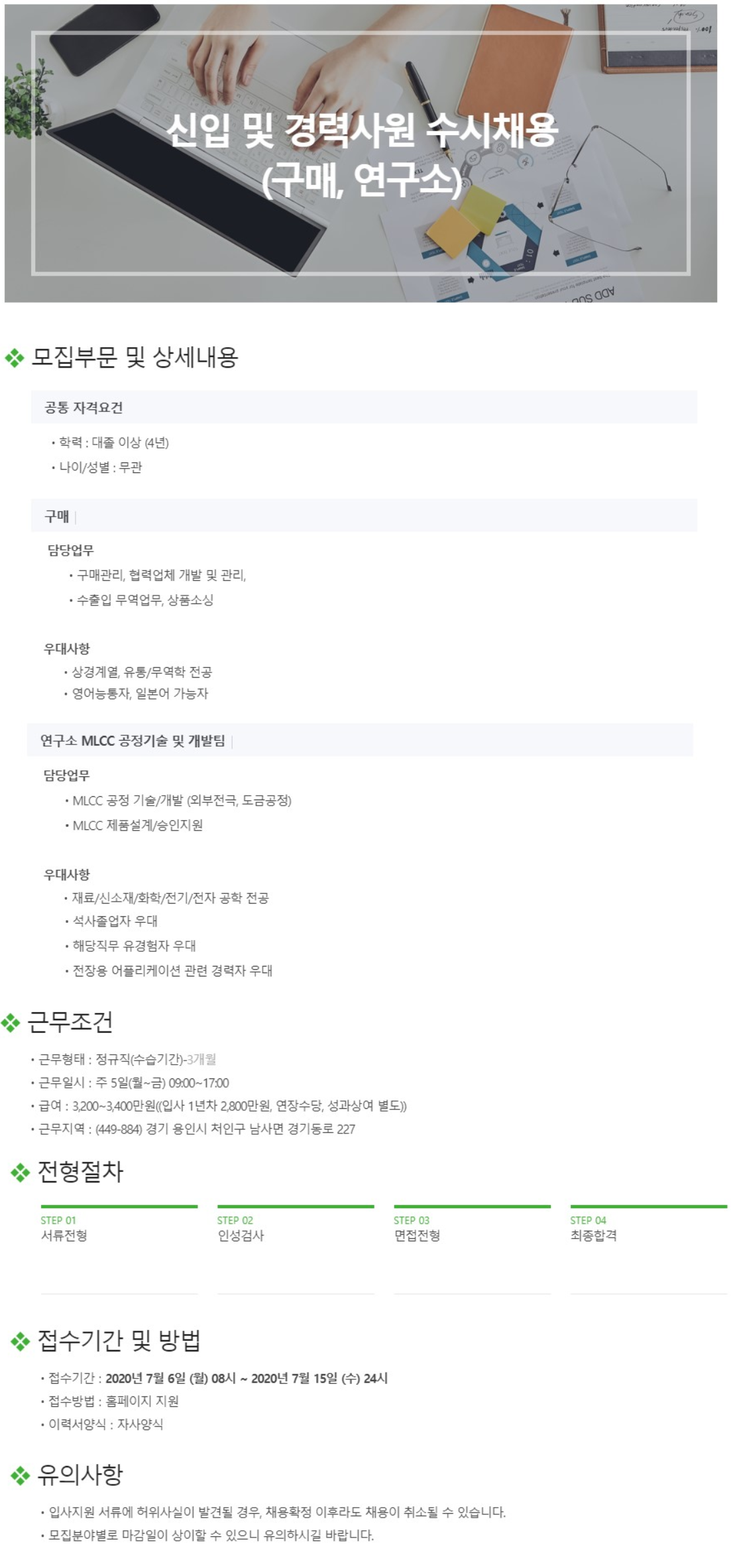 [삼화콘덴서공업] 2020년 7월 신입 및 경력사원 수시채용-연구소, 구매팀