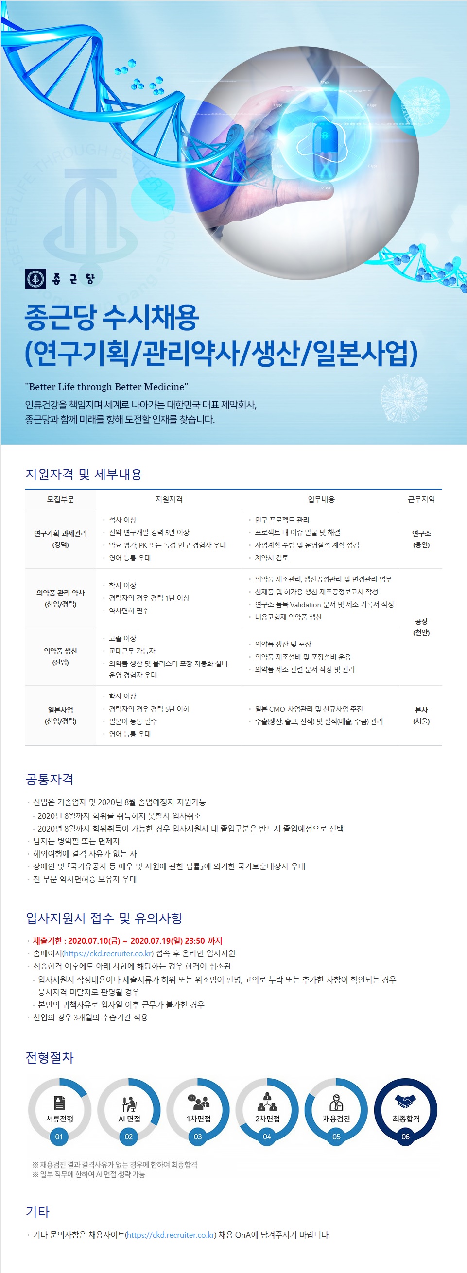 [종근당] 수시채용(연구기획/관리약사/생산/일본사업)