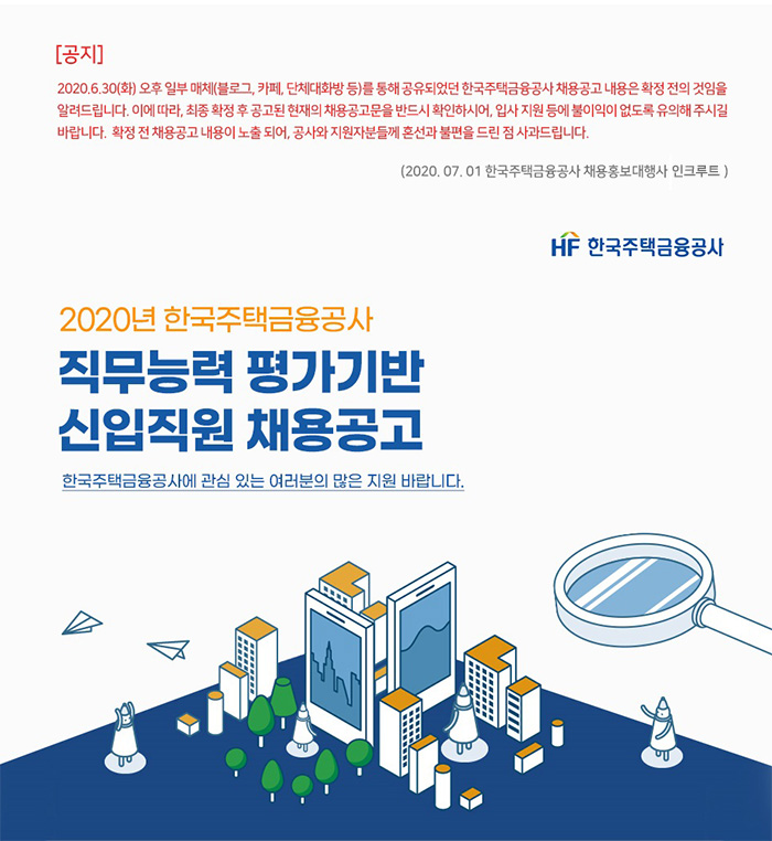 [한국주택금융공사] 2020년 직무능력 평가기반 신입직원 채용공고