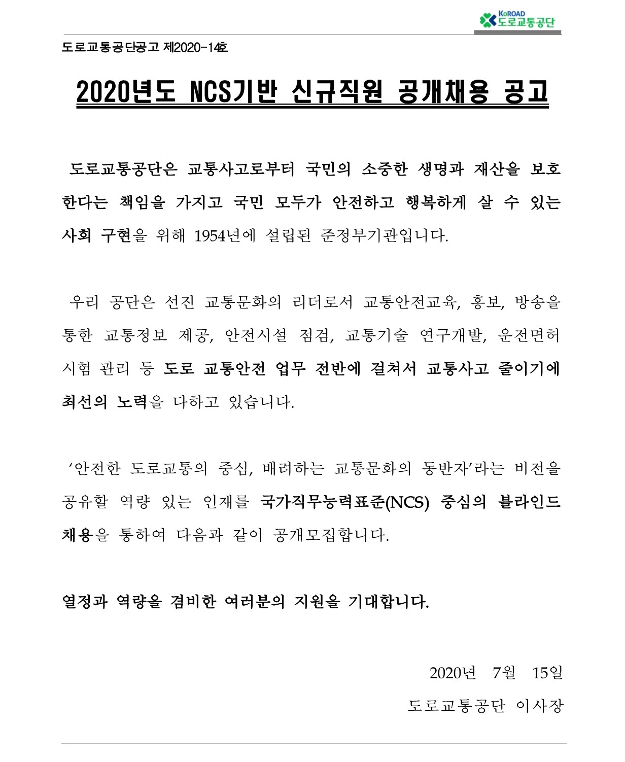 [도로교통공단] 2020년도 NCS기반 신규직원 공개채용 공고