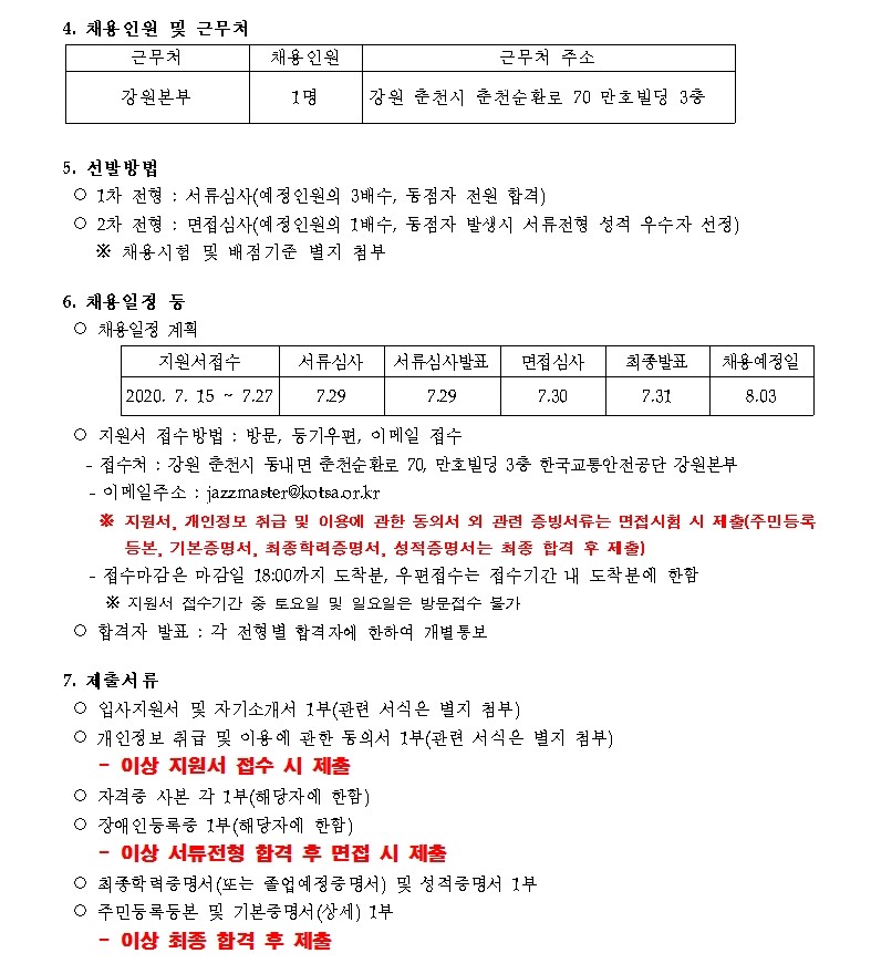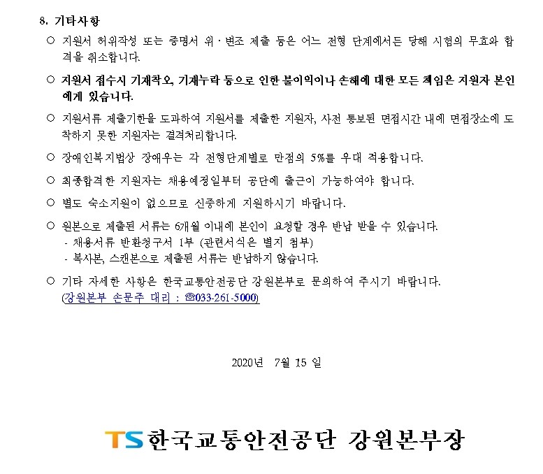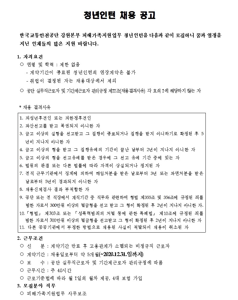 [한국교통안전공단] 강원본부 피해가족지원업무 청년인턴(행정) 채용 공고