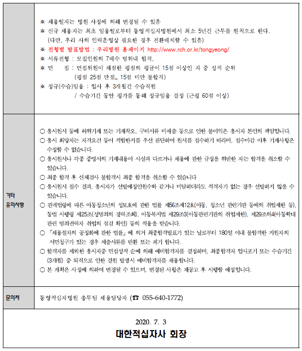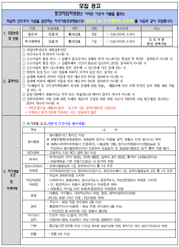[대한적십자사 통영적십자병원] 정규직/무기계약직 간호사 모집
