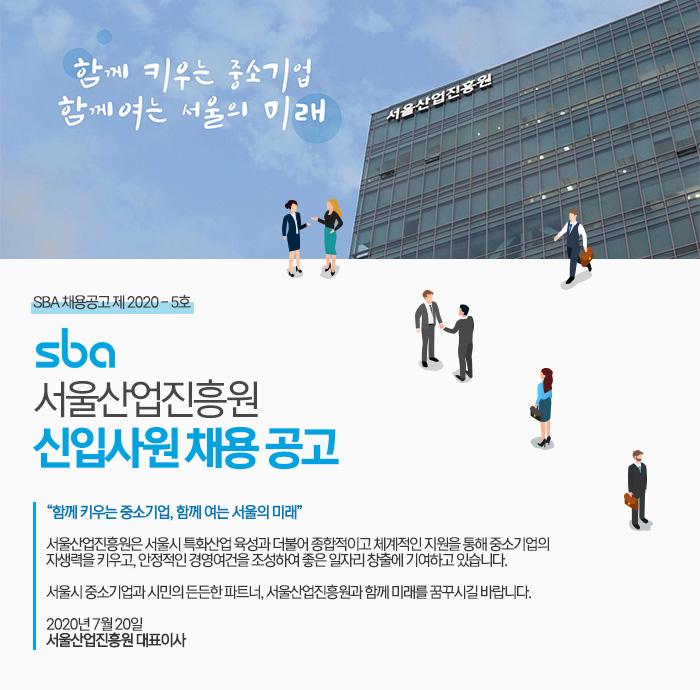 가. 접수기간: 2020.7.20.(월) ~ 8.10.(월) 18:00 (시간 엄수)나. 접 수 처: 채용 홈페이지에서 온라인 접수 (https://sba.recruiter.co.kr)