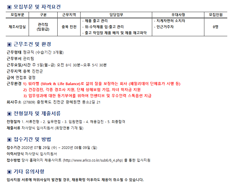 [알리코제약 제조사업실 / 관리팀 (팀원급)] 채용공고